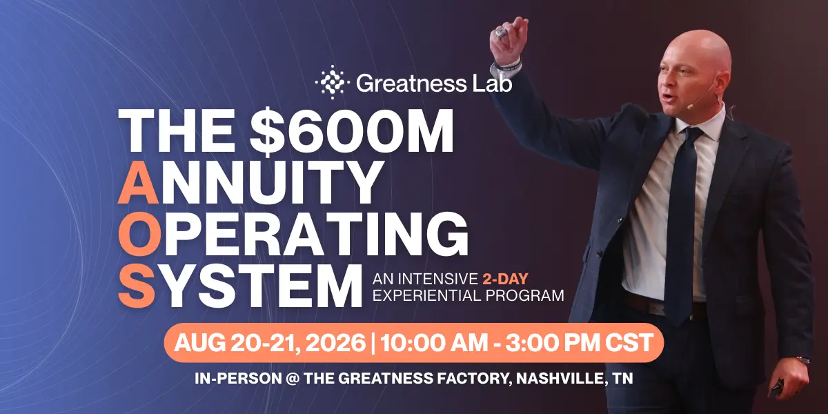 The annuity sales system behind $600 million in production across 700+ advisors and 6 regional brands. Two days breaking down how to position, close, and scale annuity revenue, led by the team that built it. In-person at the Greatness Factory or live stream from anywhere.